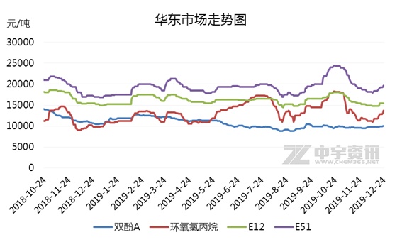 从环氧树脂产业链走势图上看出,2019年环氧树脂市场跟随原料环氧氯丙烷市场波动的特点依然明显。进入12月份以来环氧树脂市场多上行为主,尤其是液体树脂表现的更为突出。尤其是原料环氧氯丙烷涨势明显,本月高低点价差高达3000元/吨。而另一原料双酚A则表现出窄幅整理的态势,波动幅度相对有限。