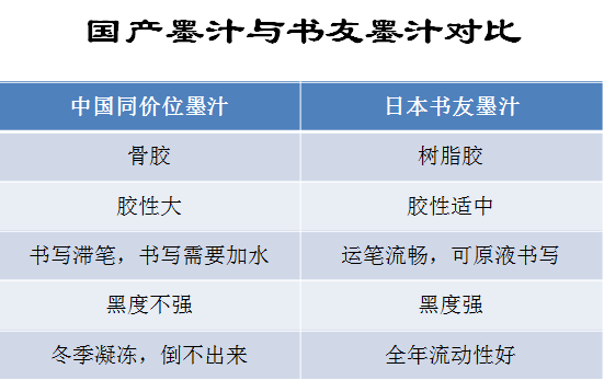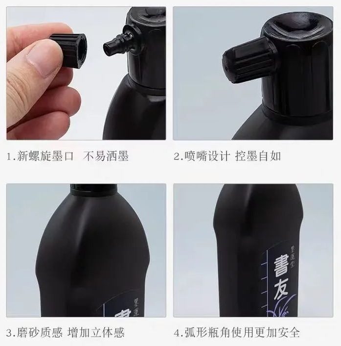 书友的浓度和胶性适合大多数纸张和大多数人的书写习惯,即使在寒冷的冬天,国产墨汁凝冻后,书友仍能保持很好的流动性。使用原液书写,免去兑水麻烦,既实用又方便。作品完成之后,待墨迹干透装裱也不会跑墨。