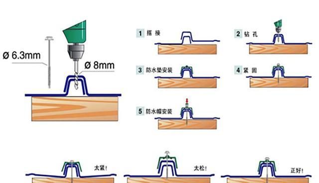 打钉数量建议每平米4套,风大或者地震频发地区,或者屋面坡度太陡,需要进行加固安装,增加到每平米4套固定件。首先要进行打孔,在树脂瓦波峰处采用直径为8mm的钻头钻孔,孔径大于自攻丝直径;钉子只能打在树脂瓦波峰上,每间隔一个波峰安装一套防水固定件。