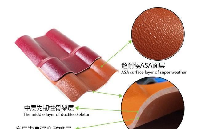 合成树脂瓦是用进口高耐候树脂ASA作为表层材料的,具有相当高的耐磨性、耐候性和韧性,中间是骨架层,能使树脂瓦抗压能力更强,底层是全新PVC树脂,并且采用三层共挤的挤压技术制造出来的。但是不同生产商使用的表层材料和底层材料,会存在较大区别,这就是为什么市场上有那么多种不同价格的树脂瓦产品的原因了。