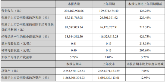 挖贝网5月6日,蓝晓科技(300487,股吧)(300487)近期发布2021年第一季度报告,报告期内公司实现营业收入293,167,908.66元,同比增长126.25%;归属于上市公司股东的净利润87,311,765.08元,同比增长229.46%。